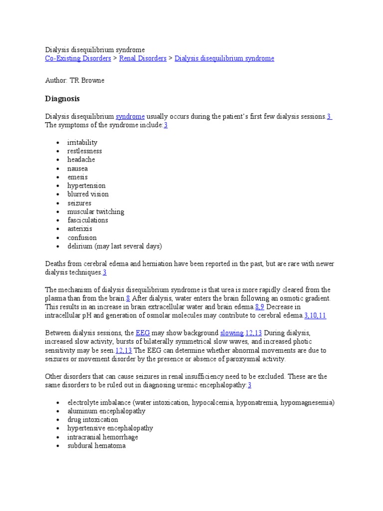 The symptoms can range from mild symptoms such as headache nausea or blurred vision as well as other CNS symptoms such as restlessness and confusion to severe manifestations with coma and seizures in rare cases. It is a diagnosis of exclusion occurring in those that are uremic and hyperosmolar in whom rapid corre. Dialysis disequilibrium syndrome DDS is characterized by a spectrum of neurologic symptoms that can affect patients on hemodialysis. The symptoms can range from mild symptoms such as headache nausea or blurred vision as well as other CNS symptoms such as restlessness and confusion to severe manifestations with coma and seizures in rare cases. The dialysis disequilibrium syndrome DDS is characterized by a range of neurologic symptoms that affect patients on hemodialysis particularly when they are first started on dialysis 12. Symptoms result from brain edema varying from mild to severe. Does this patient have dialysis disequilibrium syndrome. Patients present with symptoms including headache nausea vomiting muscle cramps tremor confusion and convulsions. Systemic and neurological symptoms are associated with disequilibrium syndrome.