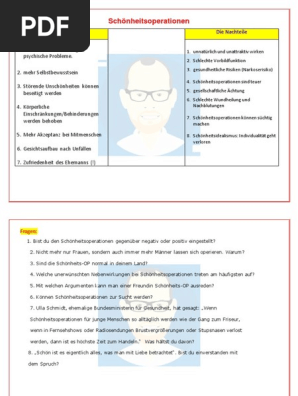 Daneben gibt es aber noch etliche weiter gründe sowie zum Beispiel der Wunsch nach einer schlankeren Figur oder. Doch unabhängig davon welche Körperregion im Zuge der plastischen Chirurgie behandelt werden abseits der grundsätzlichen Unterscheidungen der einzelnen Eingriffs- und Behandlungsarten gilt für jede Form der Schönheitsoperation ein wichtiger Grundsatz Wer schön sein will der muss leiden Schönheitsoperationen. Pro und Contra 16. Berlin New York 2003 35-58. Schönheitsoperationen - Pro und Contra. Schön zu sein hat viele Vorteile. Bei falscher Durchführung können Schönheitsoperationen schwere Schäden bis hin zum Tod zur Folge haben Durch eine solche Operation passt man sich selber auch immer an die Wertvorstellungen der Gesellschaft an anstatt so zu bleiben wie man ist. Gerade für Stars gehören Schönheitsoperationen zu ihrem Alltag dazu. O Scribd é o maior site social de leitura e publicação do mundo.