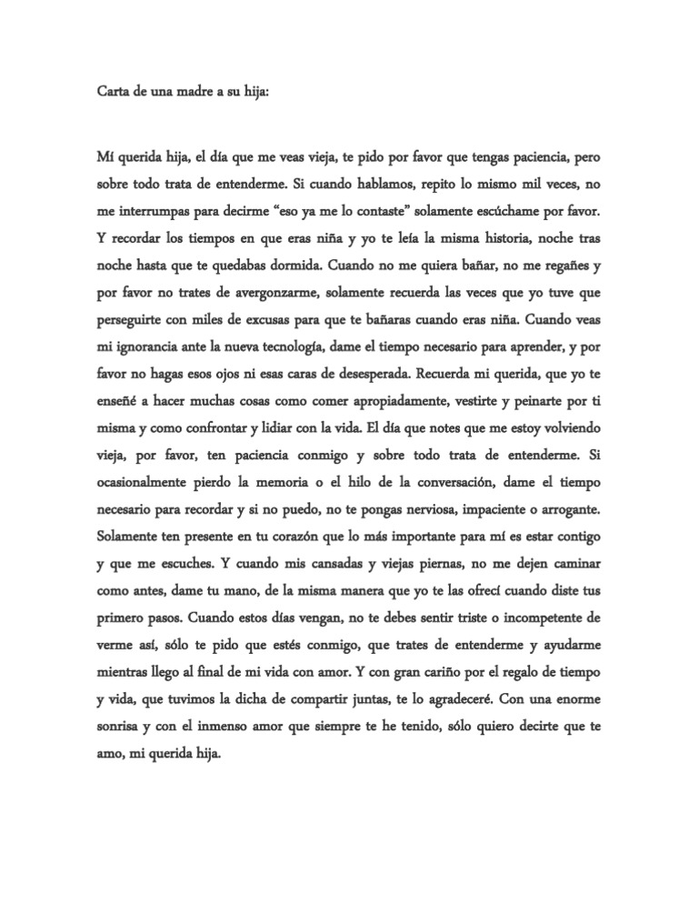 Te he apuntalado tanto en tus primeros pasos como en tus primeras comidas. Siento que fue ayer la primera vez que te vi ese momento en el que supe que había sido bendecida con el mejor presente. No te lo digo para retenerte pues siempre quise que usaras tus alas para volar y me alegra ver que estás dispuesta a usarlas. Carta de una madre a su hija. A continuación se muestran algunos ejemplos de cartas que puede escribir para su hija. Antes siempre uno oía que los padres quieren una vida mejor que las que ellos han tenido para sus hijos. Así que con motivo del Día Internacional de la Niña quiero dedicar una carta muy especial a mi hija y a todas las niñas del mundo. Si un día hiciéramos cuentas te darías cuenta de que soy yo quien te debe mucho. Pero vas creciendo y creo que ya estas herramientas son escasas.